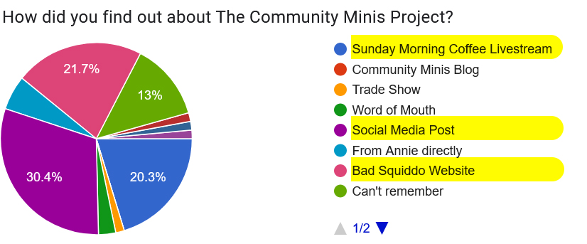 Most people are comfortable putting money down once the concept sketch is up, though even at the name point there’s quite a lot (over half). This is also reassuring, as we can generate interest fairly early with each mini.