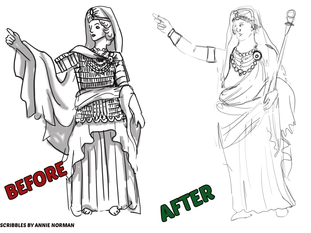 In the changes to my design I’ve lifted the arm to make it less awkward and added more elements of Augustus such as the sceptre and robe. I entirely removed the armour, as it was a while ago I can’t remember why I decided on that armour, but I was determined to how her combat prestige. Now I believe this can be done without literal armour and weapons, but definitely an alternative figure down the line of her in full Palmyran battle gear would be brilliant, and of course a mounted version (camel or horse though?).