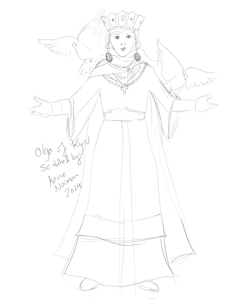 The cross we are using is the same as shown on the Monument of St. Princess Olga, built and displayed in Kyiv since 1911. Our depiction is similar all around but less Byzantine influence, as I’m placing her in an earlier style to reflect her roots.